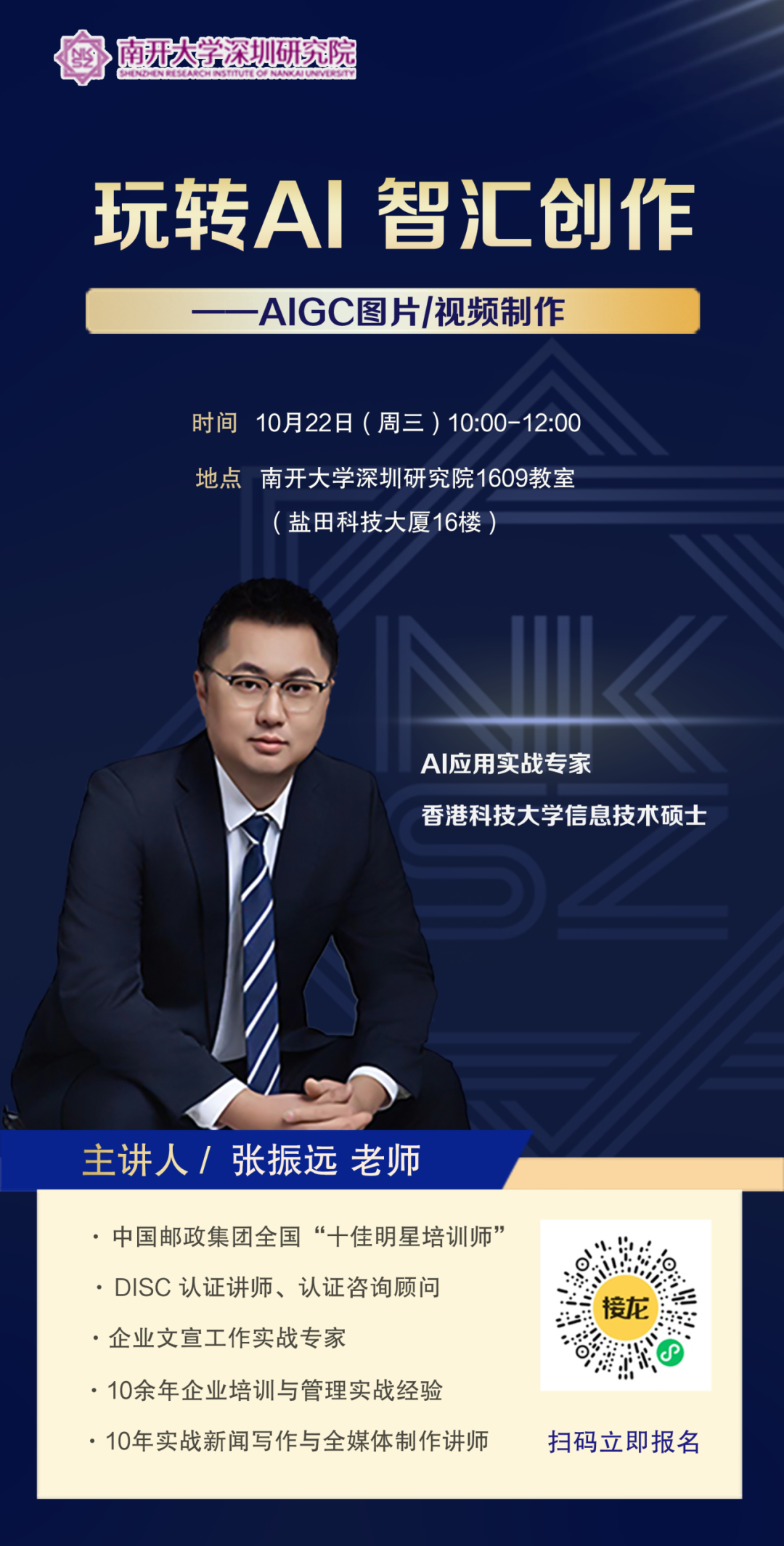 在数字化浪潮下,AIGC(生成式人工智能)正深刻改变着内容创作的方式。为帮助企业和个人紧跟技术前沿,解决在宣传素材制作中面临的质量、效率和创意难题,我院特邀拥有十余年实战经验的AIGC应用专家张振远老师,聚焦图片与视频两大核心领域,分享实用工具与高效方法,赋能大家提升智能创作技能,实现降本增效,抢占数字时代先机。