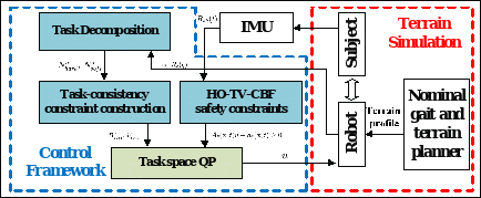 针对下肢康复训练中任务连续性与安全性难以兼顾、动态稳定性难以实时评估的问题,团队提出了基于高阶时变控制障碍函数的安全控制方法,并构建了面向多地形训练的视觉辅助步态稳定性评估方案。采用高阶时变控制障碍函数对踝关节角度边界进行显式约束,将安全约束、任务一致性约束及执行器限制统一纳入控制框架,并结合相位自适应参考规划机制,在保证训练连续性的同时抑制关节过限运动。面向多地形扰动训练过程中的稳定性量化需求,针对传统运动捕捉系统部署复杂及临床适应性不足的问题,构建了基于单目视觉的稳定裕度在线评估方案,实现了步态稳定性的实时量化,为训练参数调整与训练效果分析提供依据。该研究从安全控制与辅助评估两个层面提升了系统在复杂训练场景下的可行性与临床应用潜力。
