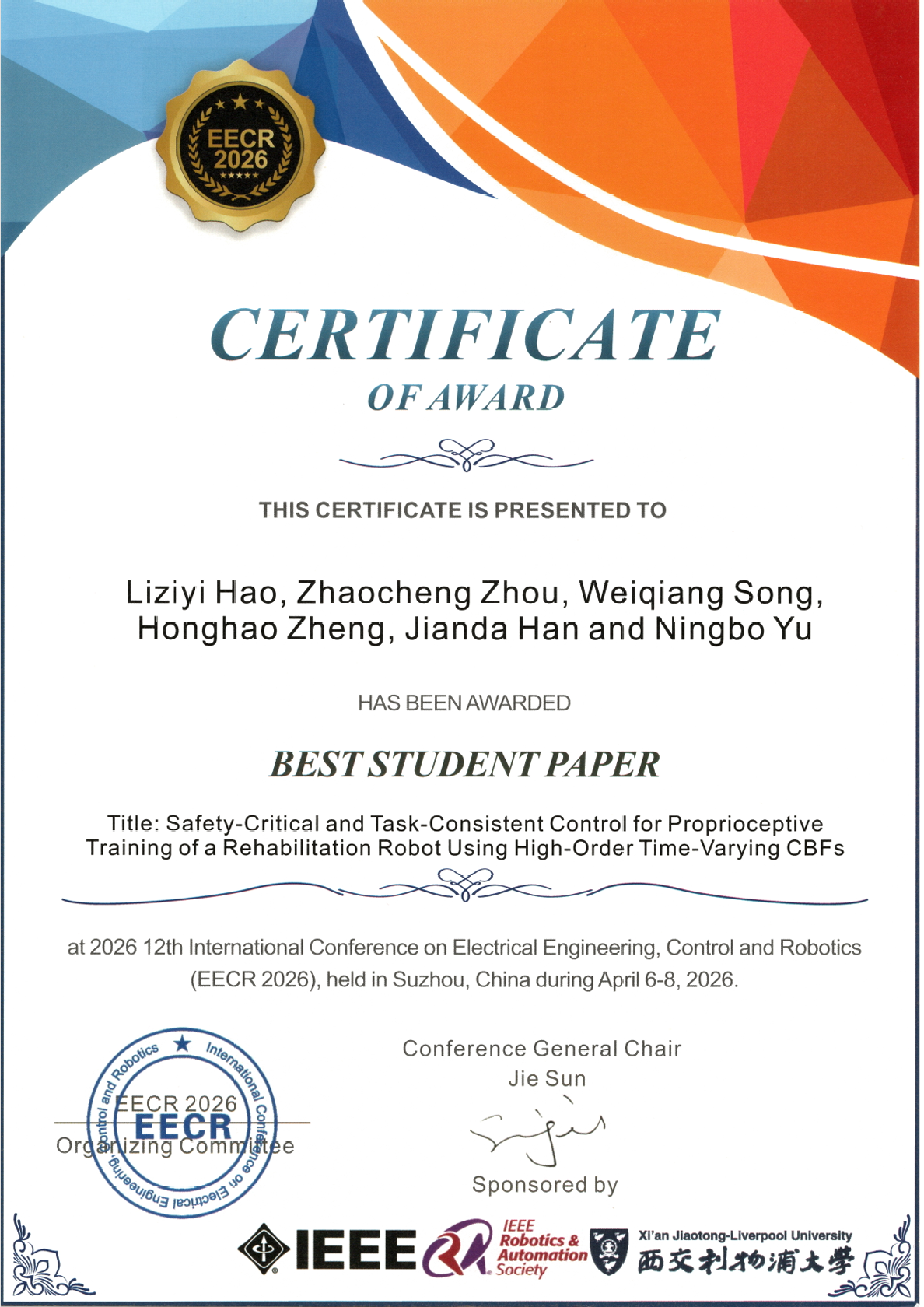 近日,第12届IEEE电气工程、控制和机器人技术国际学术会议(The 12th International Conference on Electrical Engineering, Control and Robotics, EECR 2026)于中国苏州召开,研究院韩建达、于宁波教授课题组的论文 “Safety-Critical and Task-Consistent Control for Proprioceptive Training of a Rehabilitation Robot Using High-Order Time-Varying CBFs” 荣获会议最佳学生论文奖(Best Student Paper Award),论文第一作者为博士研究生郝李子翼。